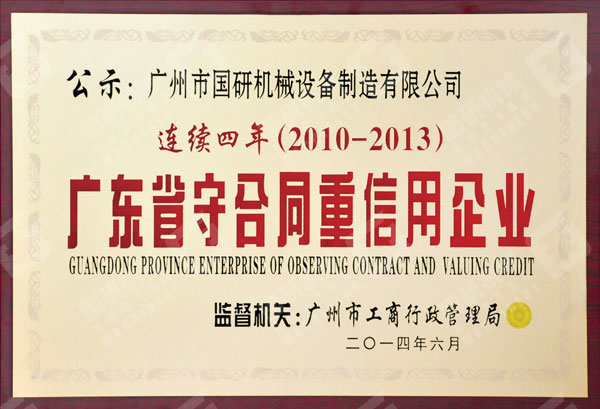 2014年7月,广州市国研机械设备制造有限公司获得由广东省工商行政管理局授予的2013年度“广州省守合同重信用企业”荣誉称号。这是公司连续多年来多次获此殊荣。