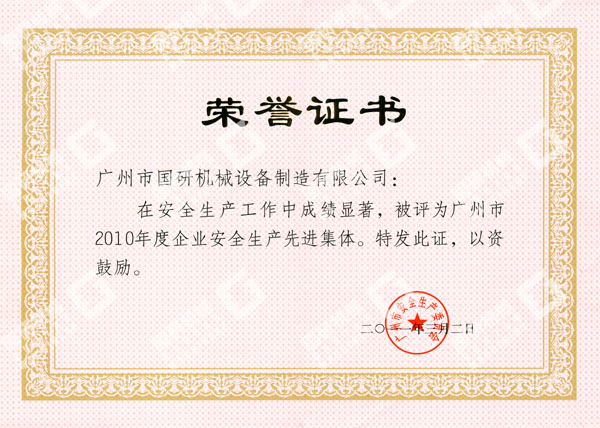 国研机械荣获“广州市2010年度企业安全生产先进集体”称号