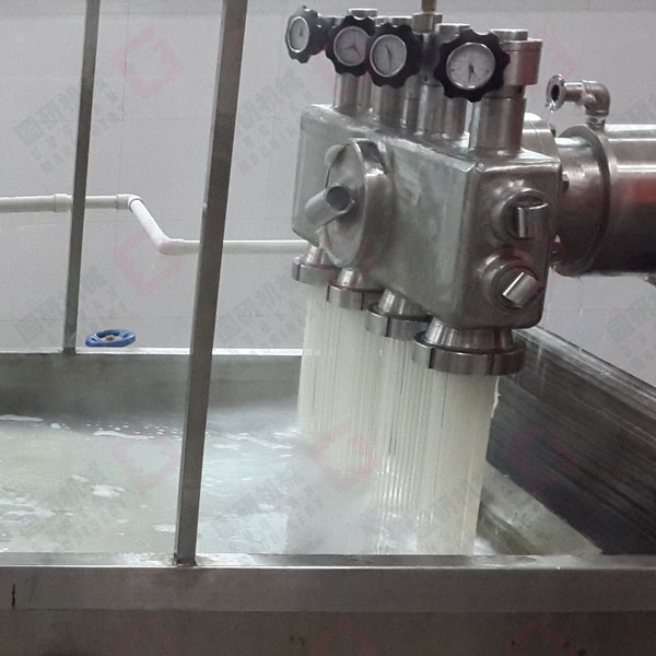大米→射流提升→除砂→泡米(发酵)→清洗→沥水→磨浆→蒸片→抗老化处理→挤条→挤丝→分行水煮→蒸粉→定量切断→水冷→保鲜处理→自动分装→包装→杀菌→储存→检查→成品
